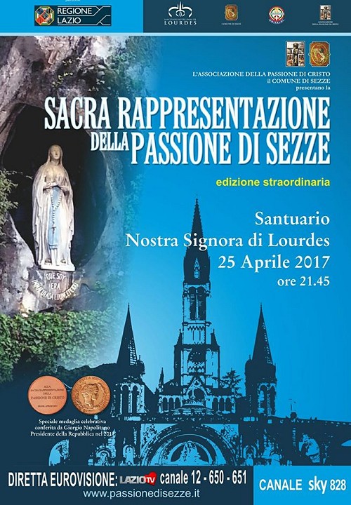 6 marzo 2017 La Sacra Rappresentazione di Sezze torna all’estero Dopo il Giubileo di Santiago di Compostela, nel marzo del 2010, quella che quest'anno si tiene a Lourdes il 25 aprile è la seconda volta all’estero per la Sacra Rappresentazione di Sezze. A partire dal Giubileo del 1950, quando per la prima volta il Dramma Sacro si è tenuto a Roma, quella di quest’anno a Lourdes è anche la decima Rappresentazione lontana dalla città di Sezze. Nell’ordine le rappresentazioni fuori dalla città di Sezze sono state: Roma, nel Giubileo del 1950 e del 2000, ancora a Roma lungo via della Conciliazione nel 2010, nel 2011 ad Assisi, nel 2012 a Latina, nel 2013 a San Giovanni Rotondo, nel 2014 sotto l'Abbazia di Montecassino e per finire con il Giubileo della Misericordia dello scorso anno sempre a Roma davanti alle reliquie di San Carlo a San Francesco a Ripa. Tutte le informazioni relative alla storia e tradizione della Sacra Rappresentazione della Passione di Cristo di Sezze si possono trovare sui siti web