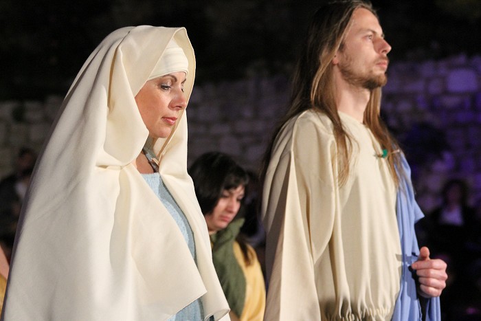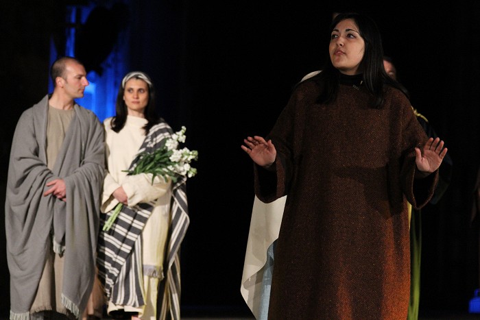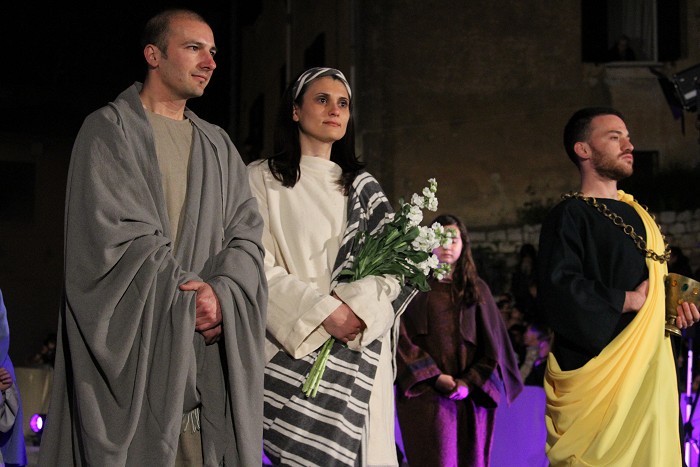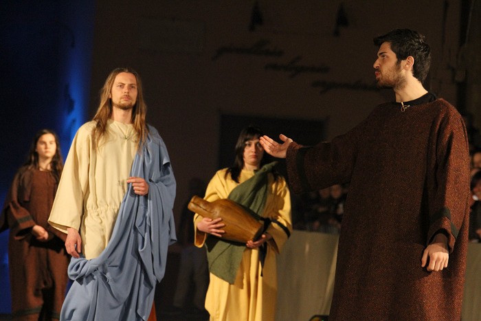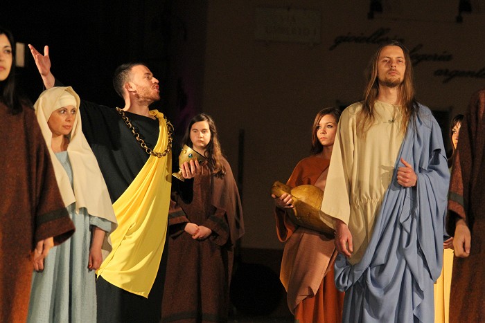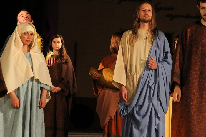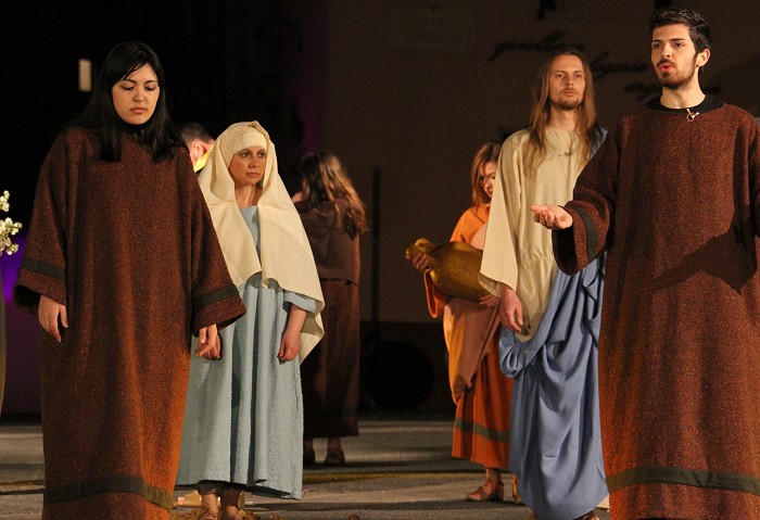 « Tre giorni dopo, ci fu una festa nuziale in Cana di Galilea, e c'era la madre di Gesù. E Gesù pure fu invitato con i suoi discepoli alle nozze. Venuto a mancare il vino, la madre di Gesù gli disse: "Non hanno più vino". Gesù le disse: "Che c'è fra me e te, o donna? L'ora mia non è ancora venuta". Sua madre disse ai servitori: "Fate tutto quel che vi dirà". C'erano là sei recipienti di pietra, del tipo adoperato per la purificazione dei Giudei, i quali contenevano ciascuno due o tre misure. Gesù disse loro: "Riempite d'acqua i recipienti". Ed essi li riempirono fino all'orlo. Poi disse loro: "Adesso attingete e portatene al maestro di tavola". Ed essi gliene portarono. Quando il maestro di tavola ebbe assaggiato l'acqua che era diventata vino (egli non ne conosceva la provenienza, ma la sapevano bene i servitori che avevano attinto l'acqua), chiamò lo sposo e gli disse: "Ognuno serve prima il vino buono; e quando si è bevuto abbondantemente, il meno buono; tu, invece, hai tenuto il vino buono fino ad ora". Gesù fece questo primo dei suoi segni miracolosi in Cana di Galilea, e manifestò la sua gloria, e i suoi discepoli credettero in lui. »