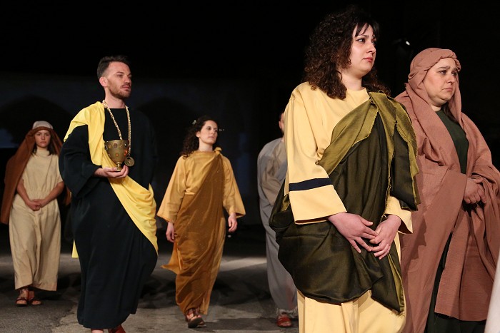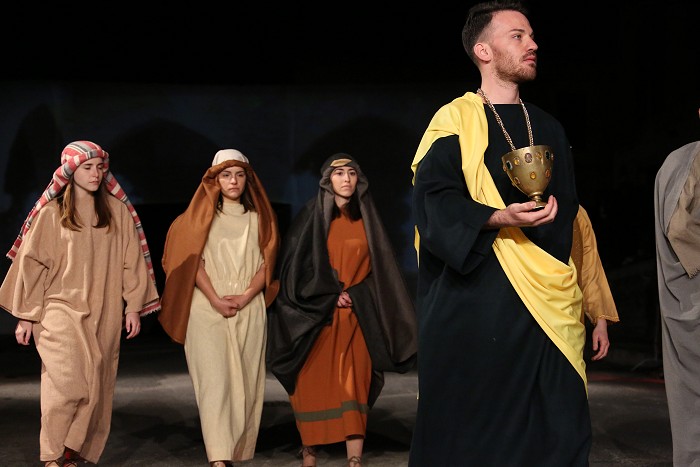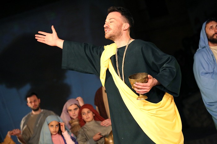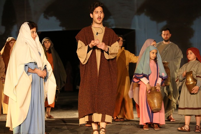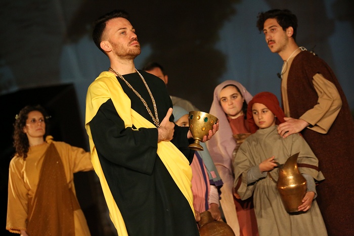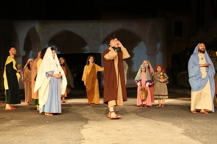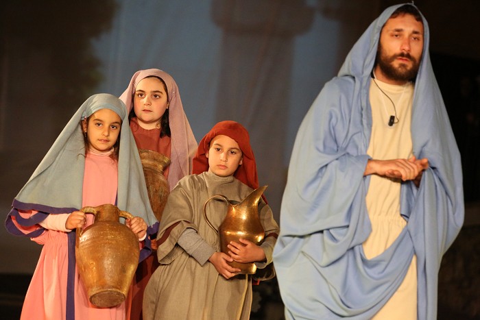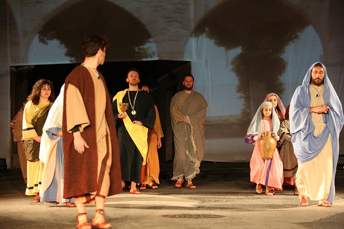 « Tre giorni dopo, ci fu una festa nuziale in Cana di Galilea, e c'era la madre di Gesù. E Gesù pure fu invitato con i suoi discepoli alle nozze. Venuto a mancare il vino, la madre di Gesù gli disse: "Non hanno più vino". Gesù le disse: "Che c'è fra me e te, o donna? L'ora mia non è ancora venuta". Sua madre disse ai servitori: "Fate tutto quel che vi dirà". C'erano là sei recipienti di pietra, del tipo adoperato per la purificazione dei Giudei, i quali contenevano ciascuno due o tre misure. Gesù disse loro: "Riempite d'acqua i recipienti". Ed essi li riempirono fino all'orlo. Poi disse loro: "Adesso attingete e portatene al maestro di tavola". Ed essi gliene portarono. Quando il maestro di tavola ebbe assaggiato l'acqua che era diventata vino (egli non ne conosceva la provenienza, ma la sapevano bene i servitori che avevano attinto l'acqua), chiamò lo sposo e gli disse: "Ognuno serve prima il vino buono; e quando si è bevuto abbondantemente, il meno buono; tu, invece, hai tenuto il vino buono fino ad ora". Gesù fece questo primo dei suoi segni miracolosi in Cana di Galilea, e manifestò la sua gloria, e i suoi discepoli credettero in lui. »