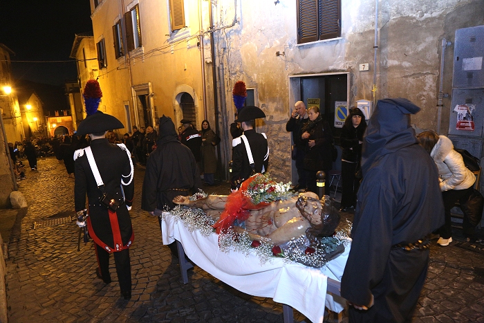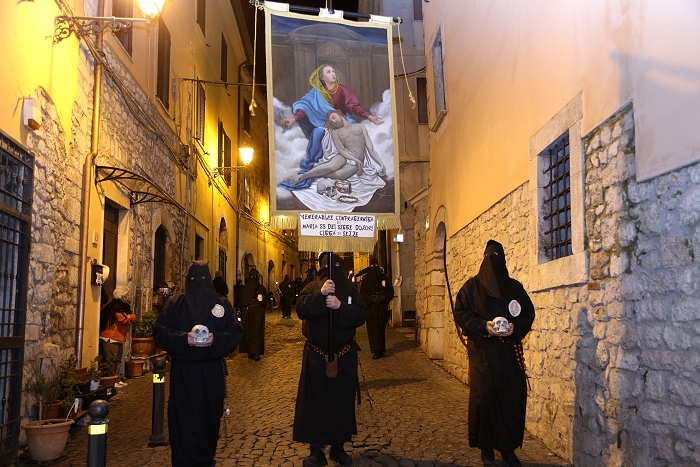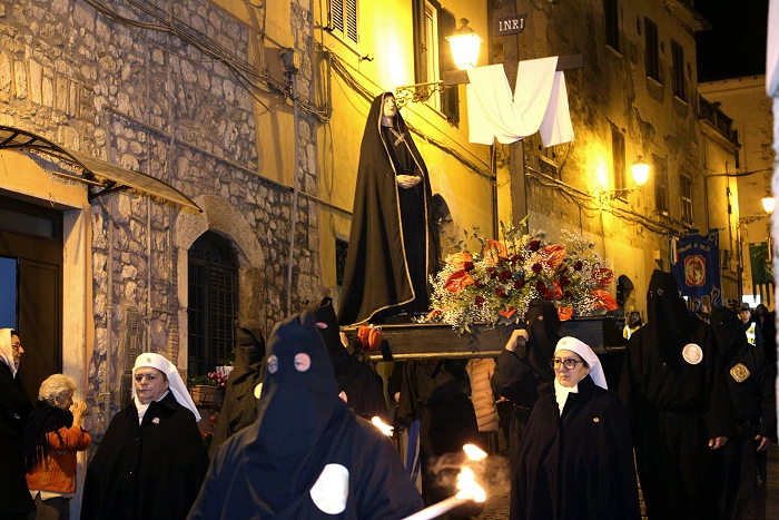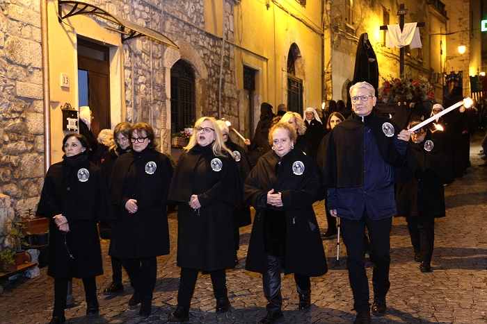 processione inizia con le Confraternite seguite dal Cristo morto e dalla Madonna dell’Addolorata cui fa da corona il canto delle pie donne è quella liturgica ed è la più antica.