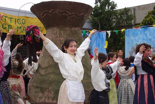 Nel cortile della scuola un grande girotondo attorno alle tradizioni di Sezze, nel centro un enorme "concono" recipiente simbolo dei paesi a sud di Roma, tutto a torno oggetti e raffigurazioni della quotidianità del tempo che fu.