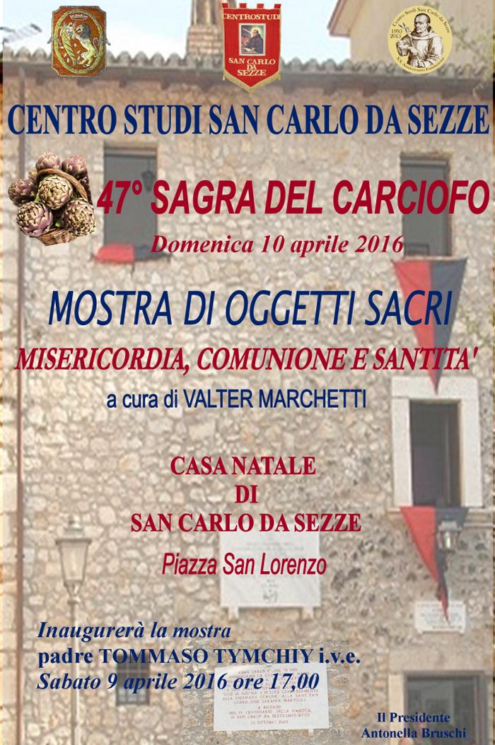 per continuare a camminare" (Papa Emerito Benedetto XVI). Partendo dalle parole di Benedetto XVI, il Centro Studi San Carlo da Sezze, in occasione della 46° edizione della Sagra del Carciofo, durante l’apertura al pubblico della Casa Natale del santo, ha promosso una mostra – ostensione di crocifissi del maestro collezionista di immagini ed oggetti sacri, il setino Pietro Mastrantoni. “San