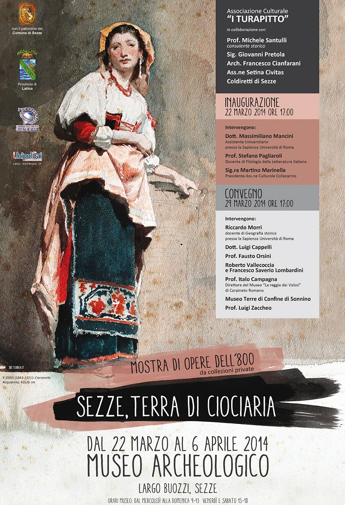 Turapitto” in collaborazione con: presenta Dal 22 marzo 2014 al 6 aprile 2014 presso il museo archeologico sito in Largo Buozzi a Sezze, Latina, sarà allestita la mostra di opere dell’800 da collezioni private. Verranno illustrati i risultati di un progetto dedicato alla Ciociaria e agli influssi che essa ha avuto su Sezze e la Conca di Suso, sul suo dialetto, gli usi e soprattutto i costumi a seguito del flusso migratorio iniziato già dal 1800. >