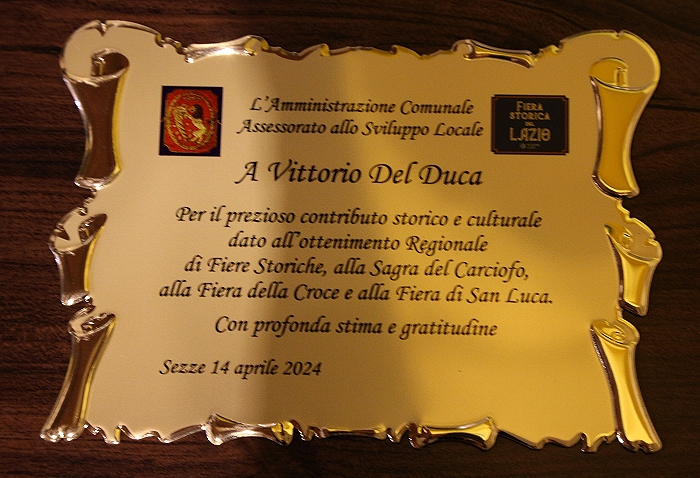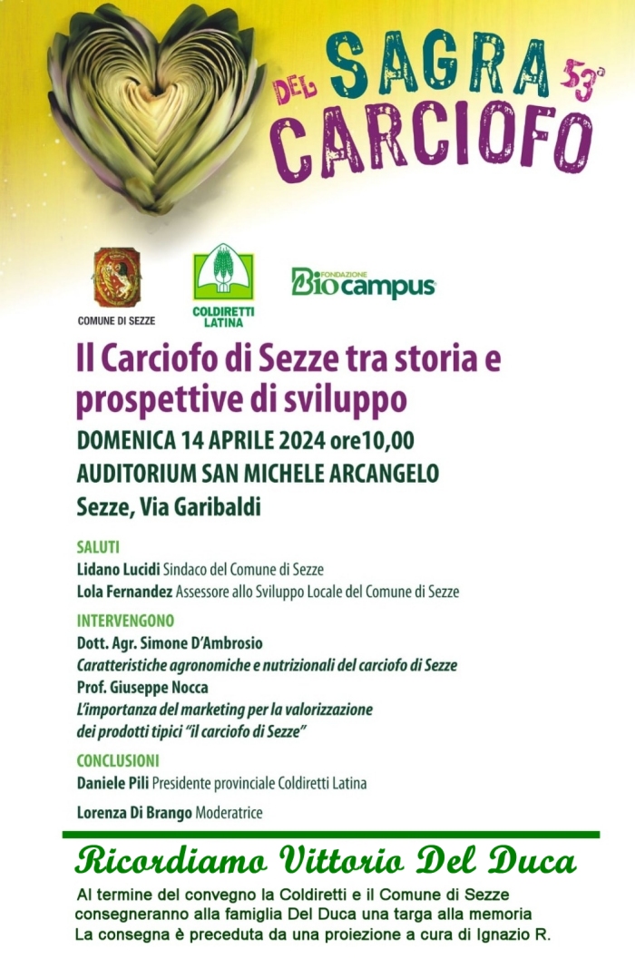Alla Sagra del Carciofo si ricorda Vittorio Del Duca, scomparso il 13 febbraio 2024. Due i momenti all'interno della manifestazione dedicati all'importante figura di Vittorio: il Convegno della Coldiretti ed il Premio Vittorio Del Duca. > il primo momento dedicato a Vittorio si tiene all'Auditorium San Michele Arcangelo dalle ore 10,00 con la consegna di una targa alla famiglia Del Duca durante il convegno della Coldiretti sulla stortia del carciofo di Sezze. Prima della consegna della targa una proiezione di foto ricorda la figura di Vittorio Del Duca attivo, oltre che nel settore agricolo, nella vita culturale del paese, in particolare nelle ricerche storiche e delle tradizioni, nelle passeggiate archeologiche sul territorio, con le attività della confraternita del Sacro Cuore di Gesù e con la presentazione dei suoi libri sui vari aspetti della vita del paese.