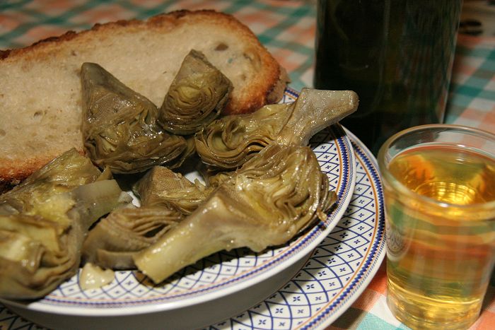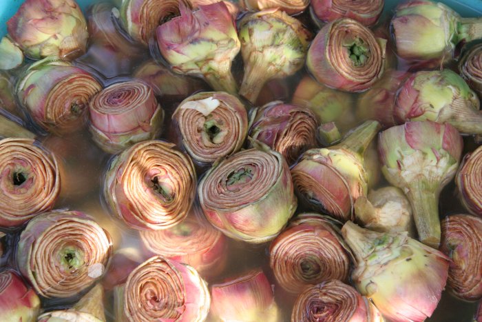 otto carciofi “cimaroli”, aglio fresco, sale grosso, olio