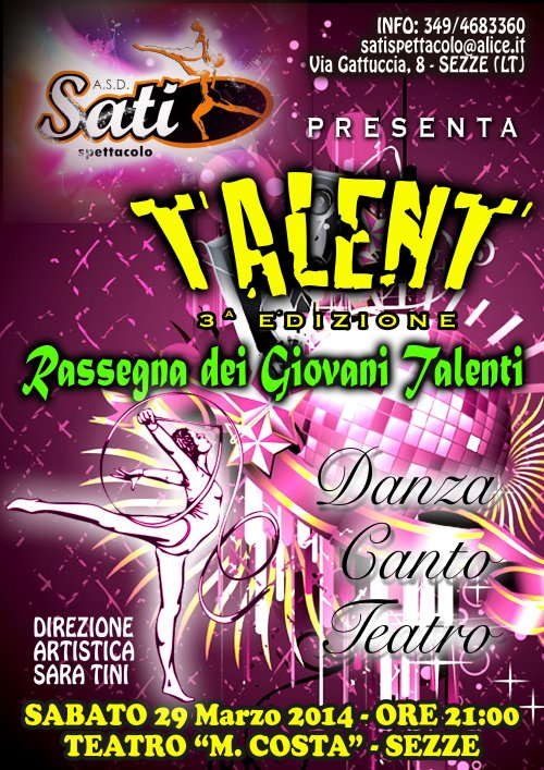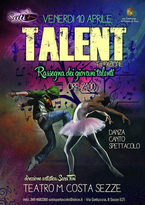 Lunedì 30 giugno alle 21:00 presso il centro sociale “Ubaldo Calabresi” a Sezze va in scena il musical “Notre Dame de Paris”. Ad esibirsi nell’opera popolare scritta da Luc Plamondon e messa in musica da Riccardo Cocciante, tratta dall’omonimo romanzo di Victor Hugo, saranno gli allievi della scuola Sati Spettacolo, coordinati da Sara Tini. Il musical è stato riadattato alle esigenze della scuola Sati Spettacolo, considerati il numero degli allievi della scuola setina e le loro diverse fasce di età. Si cimenteranno nelle varie discipline della danza, della recitazione e del canto, quest’ultimo sarà realizzato tutto dal vivo. Inoltre ci saranno ospiti professionisti nel campo del musical: Flavio Capasso, Enzo Mastrocicco, Claudio Ladisa, che affiancheranno i ragazzi durante lo spettacolo. La regia e la direzione artistica sono di Sara Tini, le coreografie sono dei maestri della scuola Viviana Grosso, Daniele Todi e Sara Tini. “Come ogni anno il musical rappresenta per tutti gli allievi un grande punto di arrivo – dicono gli organizzatori – perché più che in ogni altro tipo di spettacolo possono esprimere al meglio i loro diversi talenti ed inoltre è necessario per una buona riuscita di questo un grande gioco di squadra ed è questa la caratteristica che ci contraddistingue”. L’ingresso all’evento, dopo che si saranno accomodati i genitori degli allievi impegnati nel musical, è gratuito. 29 marzo 2014 Auditorium Mario Costa, ore 21,00 SATI presenta la 3a edizione di TALENT