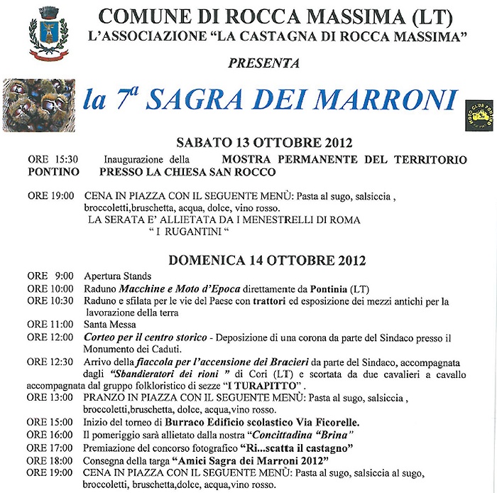 7° Sagra dei Marroni a Rocca Massima Per il gruppo folkloristido "I Turapitto" l'esibizione di domenica 14 ottobre, alla 7° Sagra dei marroni a Rocca Massima, è stata la prima uscita fuori le mura di Sezze. Uscita di successo molto apprezzata dai poco più di mille rocchiggiani che hanno affollato la piccola piazza del paese.